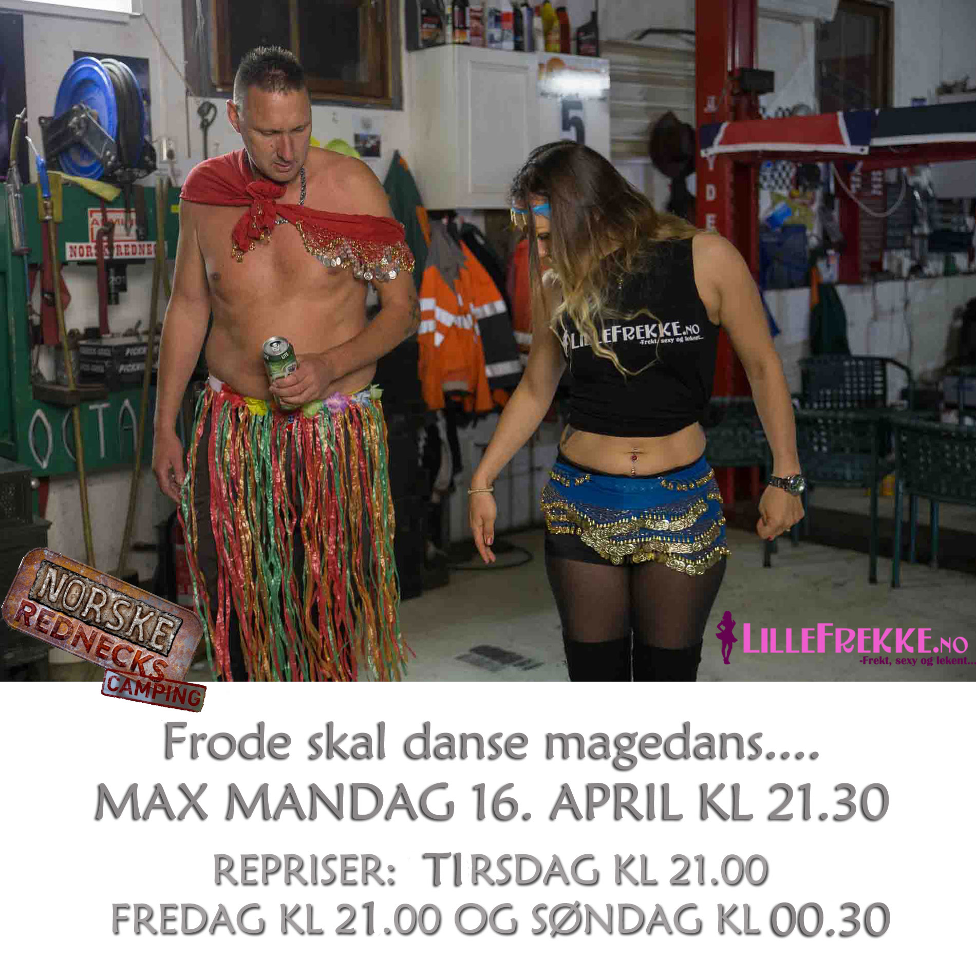 Nå er det bare å benke seg foran TV-skjermen igjen og følge med på hvordan det går med Redneckgjengen. På mandagens episode vil du få se hvordan det gikk da LilleFrekke modellen Aina skulle lære Redneck Frode magedans.. Dette skjedde da vi var på fest i garasjen hos Frode i fjor høst i anledning Veteranbildagen i Tofte. (Link til flere bilder fra helgen finner du nedenfor.) I episode nr 22 i Norske Rednecks Camping vil du altså få være med på denne uforglemmelige opplevelsen i en garasje på Hurum. Dessuten får du også se Frodes forsøk i tissue, litt fra Ainas poleopptreden og noen glimt av Kristinas rockeringshow. Medeier i LilleFrekke, Store Frekke Geir, dukker også opp på skjermen da han sang og spilte gitar rundt bålet hos Frode.