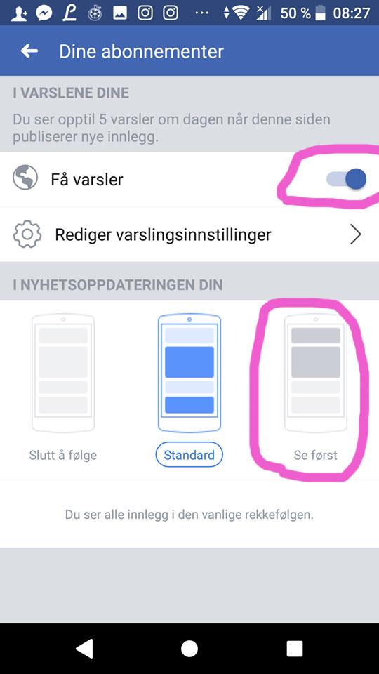 Bruker du smarttelefon,så er oppsettet litt annerledes. Du må først klikke FØLGER (like ved siden av Likerknappen), så må du velge Varslingsinstillinger, da får du frem noen nye valg, sjekk at disse to er merket av: