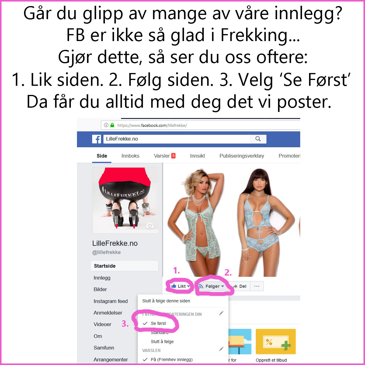 Vi gjør stadig nye tiltak for å forsøke gi våre kunder og andre Frekkinger det de ønsker, og her er et nytt tiltak. Følg oppskriften på bildet, så får du alltid med deg våre innlegg. Klikk på bildet, så kommer du rett til Facebooksiden vår og kan sjekke/endre innstillingen for våre oppdateringer.